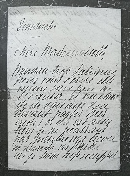 A terceira carta foi escrita no denominado mandat-lettre, na horizontal e na horizontal sobre a vertical, A data do mandat mostra-se ilegível, percebendo-se apenas o ano ‘18’. Foi enviada pela própria Chouchou (“Mlle. Debussy”): “Prezada Mlle., acabei de receber notícias suas. Acredito lembrar-me de que Mlle. comprou para mim 8 fr. 80c. em músicas, perfazendo um total de 59 fr. 80 c. Mamãe está um pouco melhor e nós partiremos amanhã à noite, com Françoise, Madeleine e minha irmã (Trata-se de Dolly, meia-irmã de Chouchou), para Arcachon. Eu vos escreverei. Desculpe-me a caligrafia. Toda a minha amizade, Chouchou”.