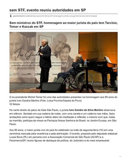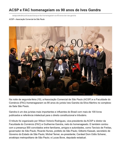 Aos 10 de Novembro, na Estação Motiva Cultural, no amplo espaço onde se encontra igualmente a Sala São Paulo, houve uma cerimônia singular com mais de 500 pessoas, na qual o advogado e professor Ives Gandra Martins, meu dileto irmão, foi homenageado efusivamente por figuras ilustres da nossa sociedade, entre eles governantes, advogados, representantes destacados da religião, da atividade empresarial, assim como numerosos amigos e admiradores. Várias entidades relevantes apoiaram a homenagem: Associação Comercial de São Paulo, Fecomercio-SP, FAC Faculdade da Associação Comercial, Secretaria de Cultura do Estado de São Paulo, Associação Paulista de Imprensa e o Deputado Estadual Lucas Bove. O neto do homenageado, Guilherme Gandra Martins Couto, foi o mestre de cerimônias, colaborando com a organização do evento juntamente com Wilson Victorio Rodrigues.